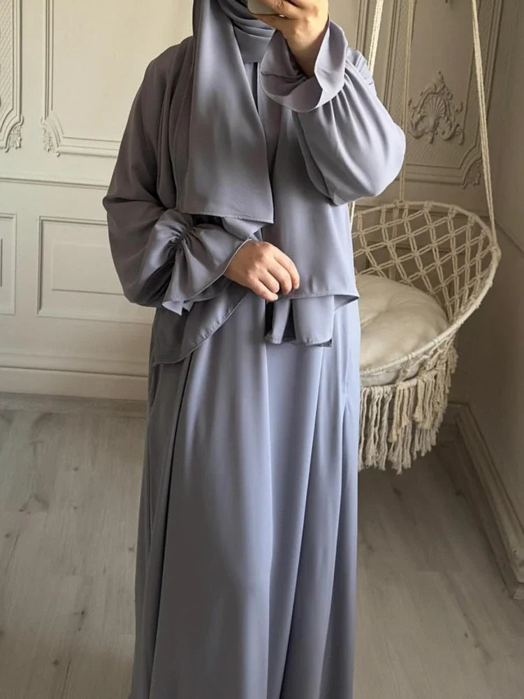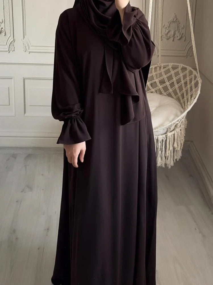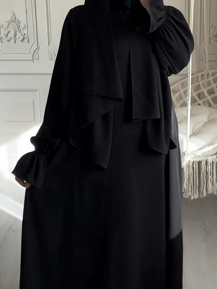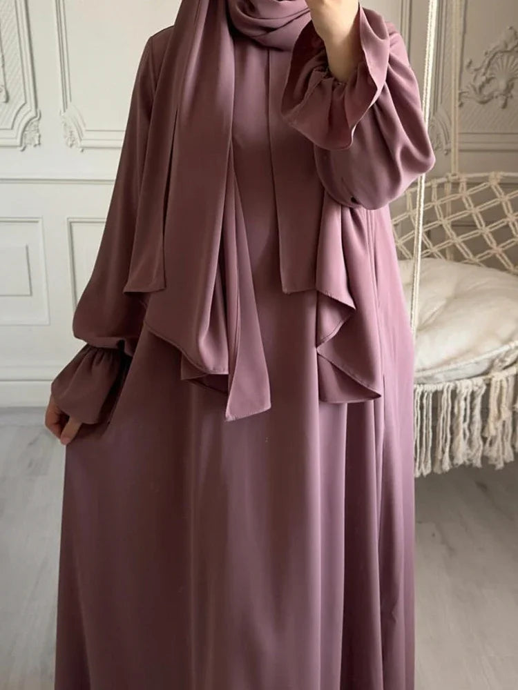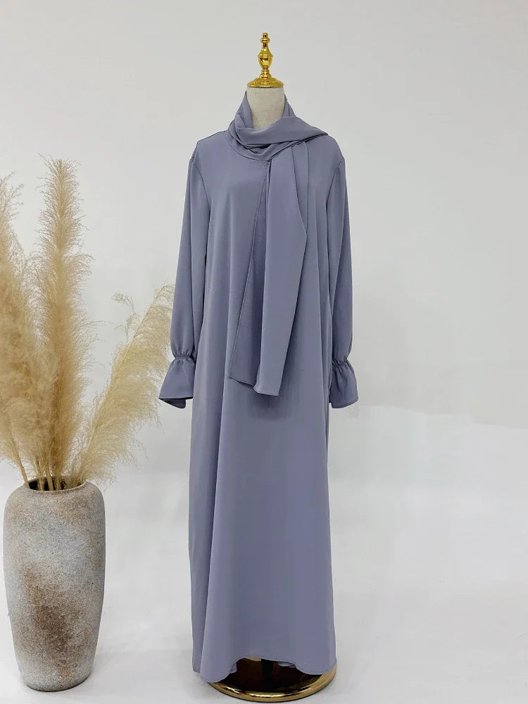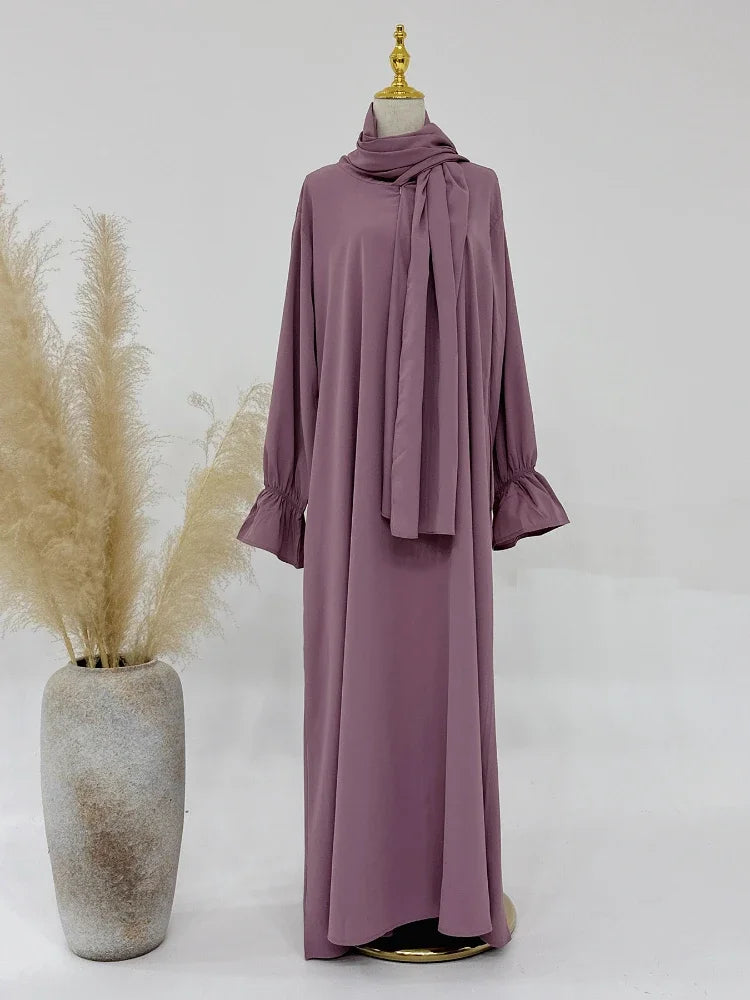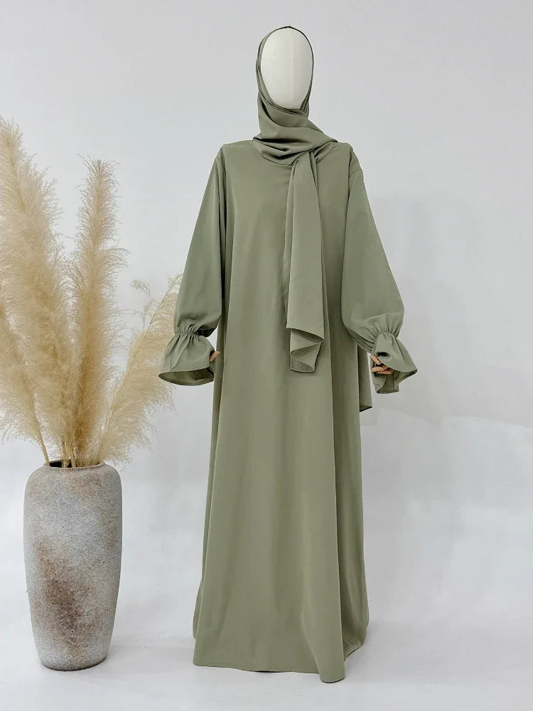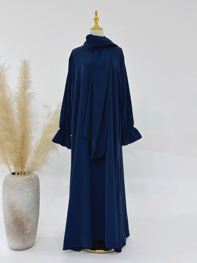 Chic and elegant, this modest long dress features stylish flare sleeves and comes with a matching scarf. Designed for comfort and versatility, it’s perfect for both everyday wear and special occasions.