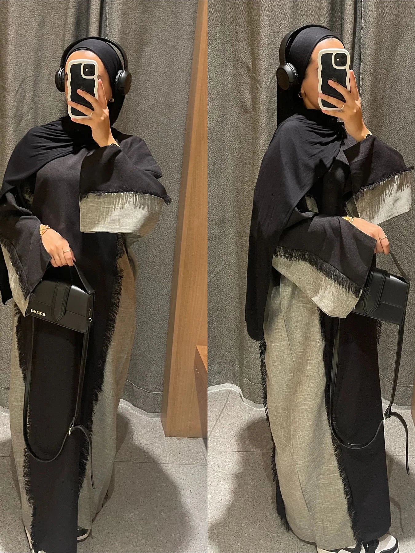 The Fringe Detail Open Abaya expertly combines traditional modesty with modern design through its elegant open-front structure and finely crafted fringe embellishments. This piece offers versatile layering options, enhancing your outfit with subtle texture and fluid movement, perfect for a sophisticated and graceful look.